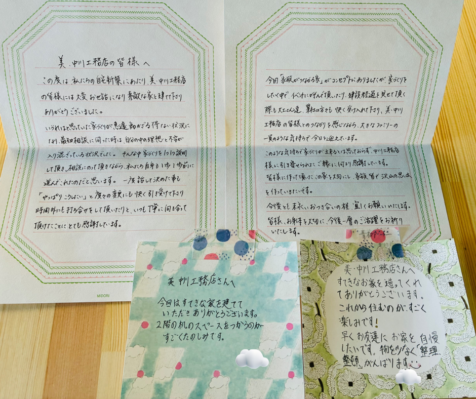 引渡しのブログでご紹介した、「家族がつながる吹抜けリビング木の家」のK様ご家族より、お手紙と素敵なプレゼントをいただきましたのでご紹介させていただきます。
