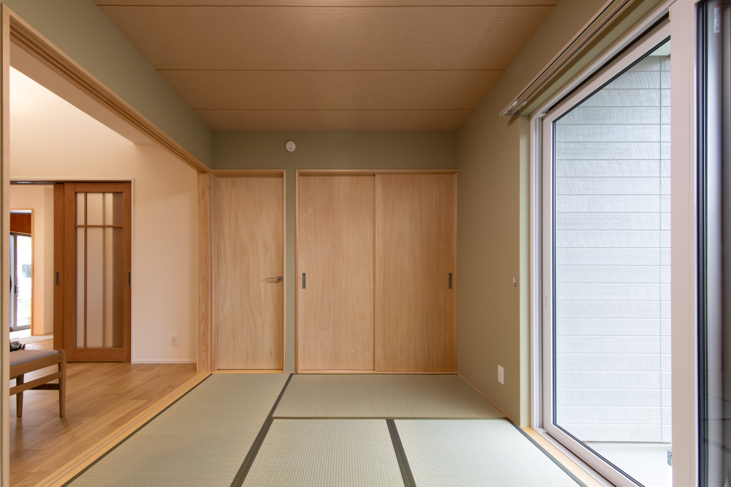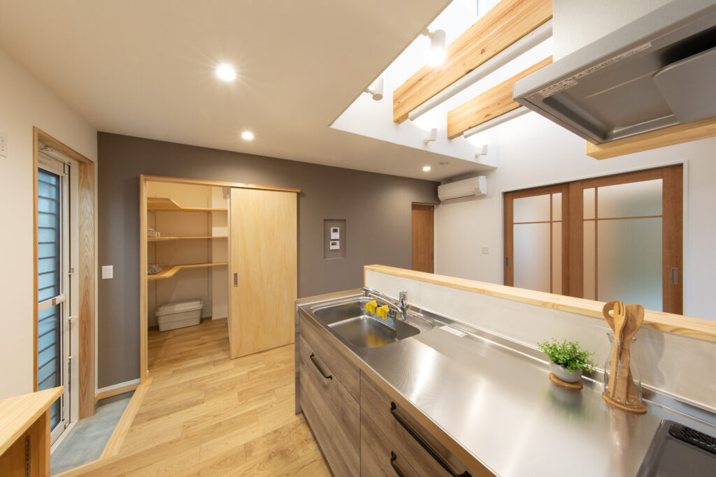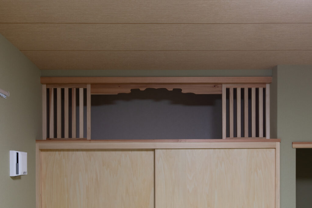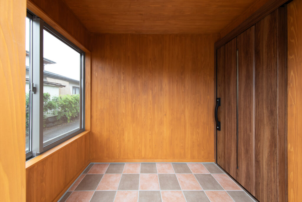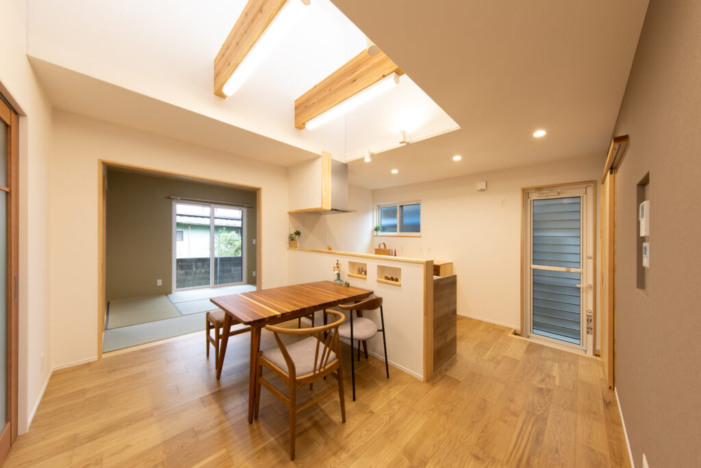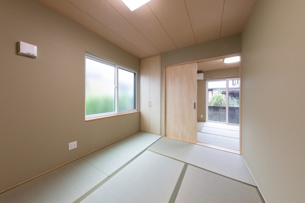 お父様、お母様のご要望で畳の部屋で寛ぐスタイルは変えずに、玄関を入ってからどの部屋に行っても冬は暖かく、夏は涼しい空間になるようにSW工法(スーパーウォール工法)をご提案しました。