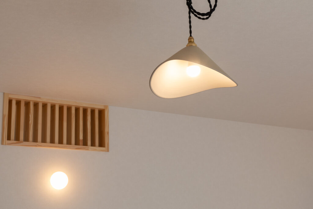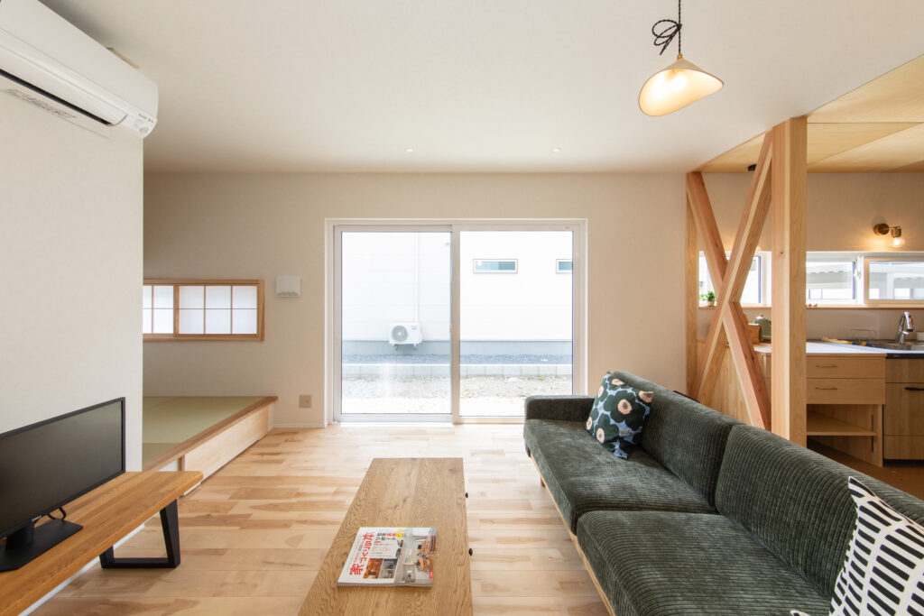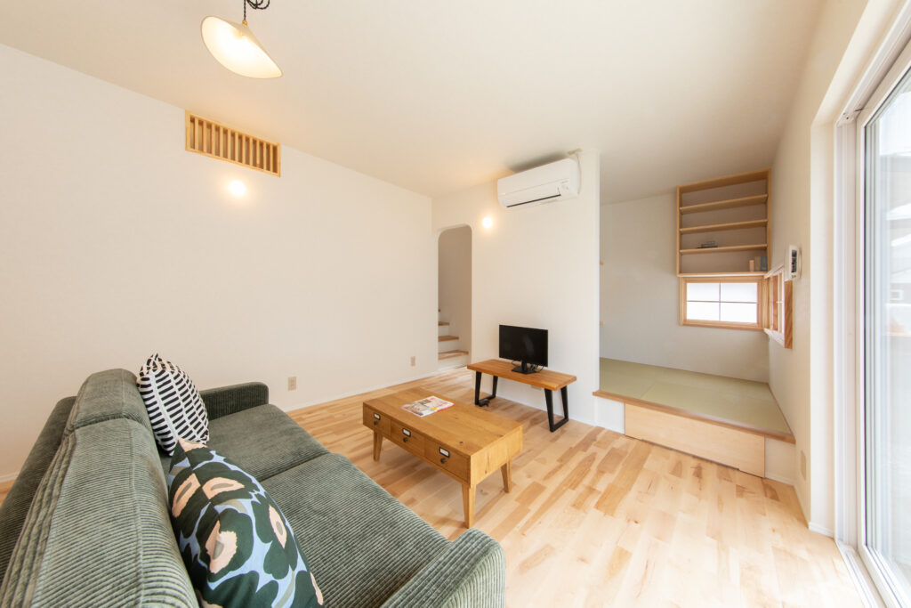 リビングの隣に小上がりタタミコーナーを設け、障子からかすかに漏れる光が空間を引き締めています。