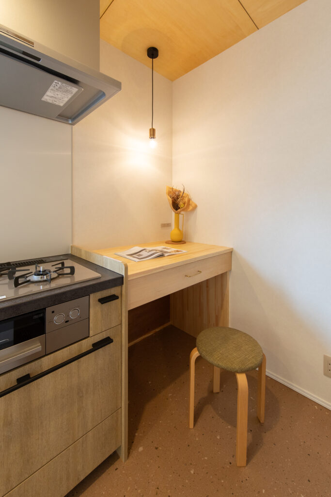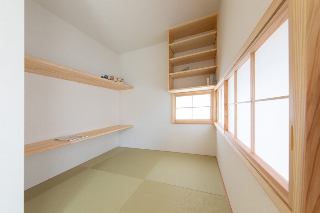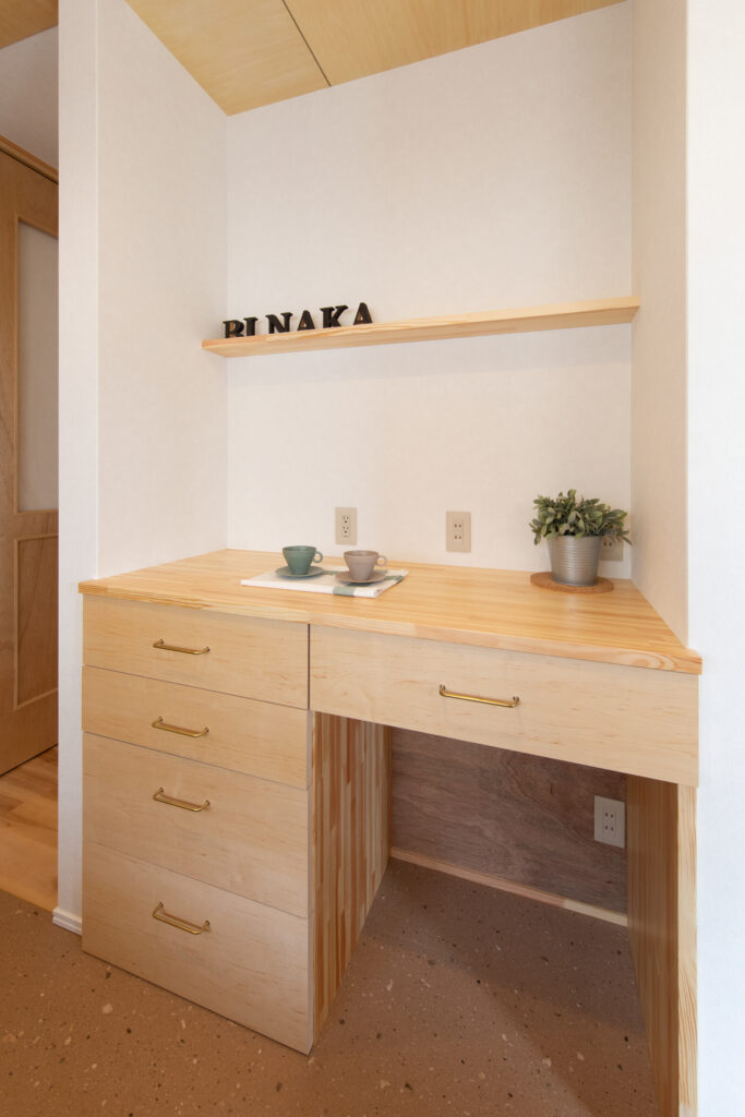 タタミコーナーには子どもの勉強にも使えるマルチなカウンターデスクを造作しました。
