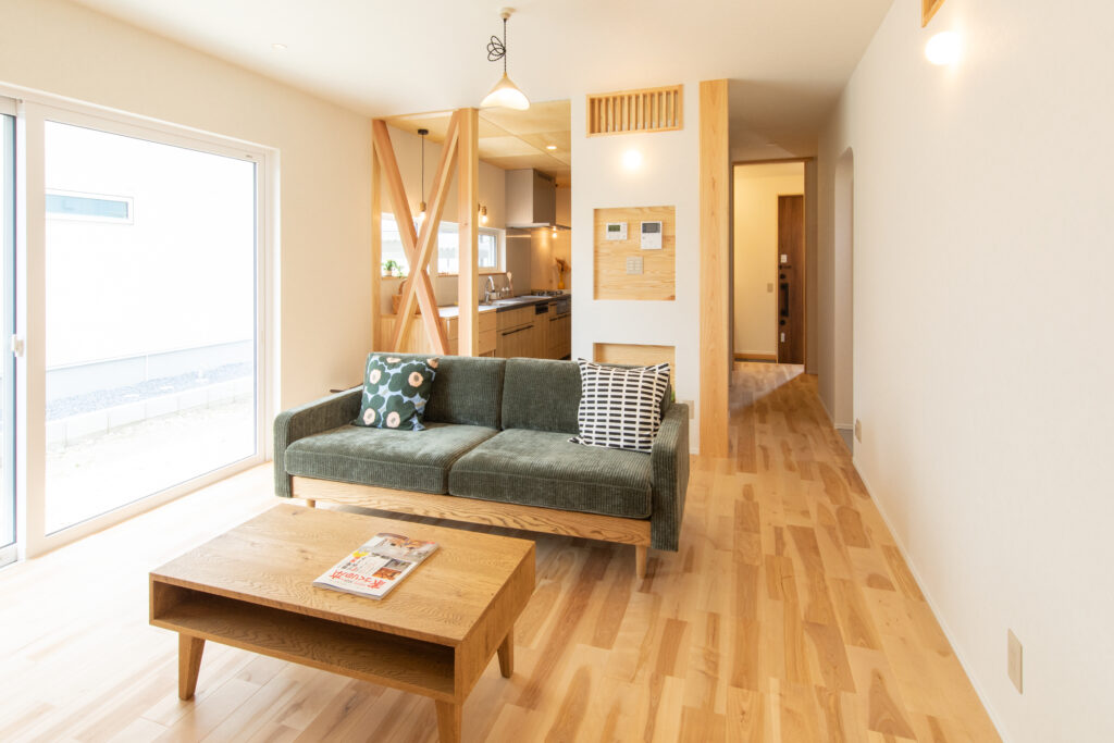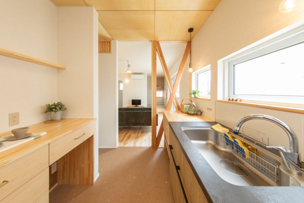 壁付けキッチンは油煙の広がりが少ないので掃除も楽々。壁付けキッチンでもリビングへの視線が抜けるように筋交いを表しにして、家族が集まりやすい空間に。