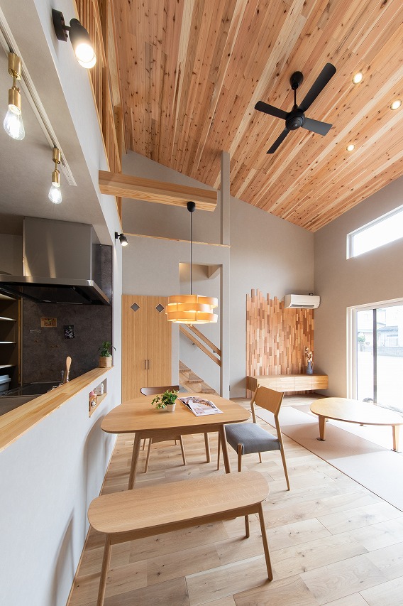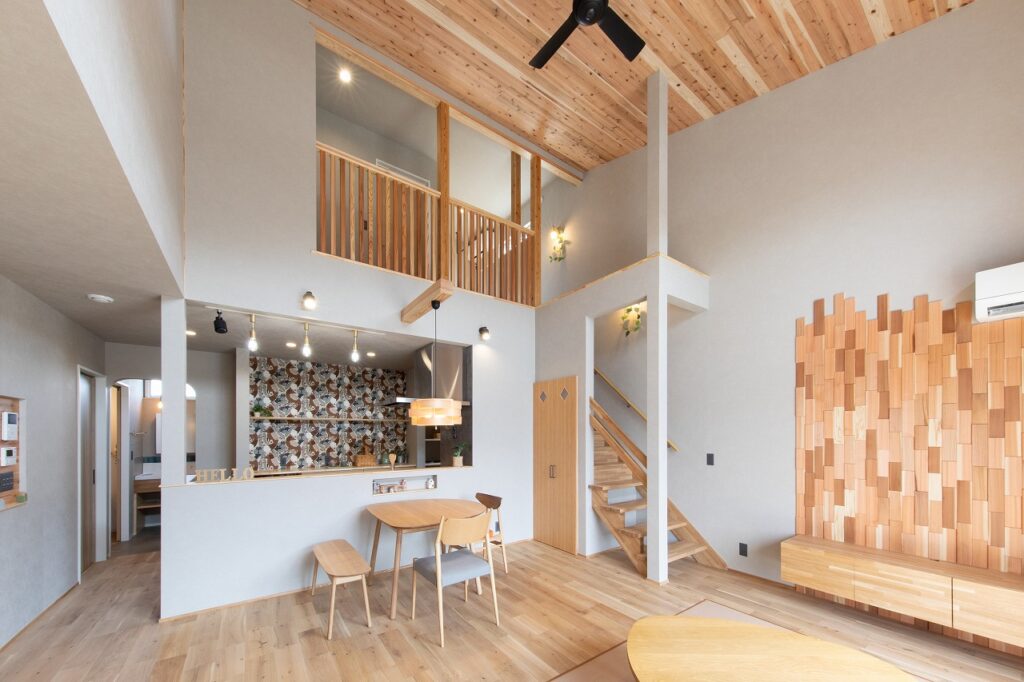 屋根勾配を生かした高い吹き抜けが印象的なリビング。畳敷きなので脚当たりが柔らかいので安全で落ち着いたリビングです。